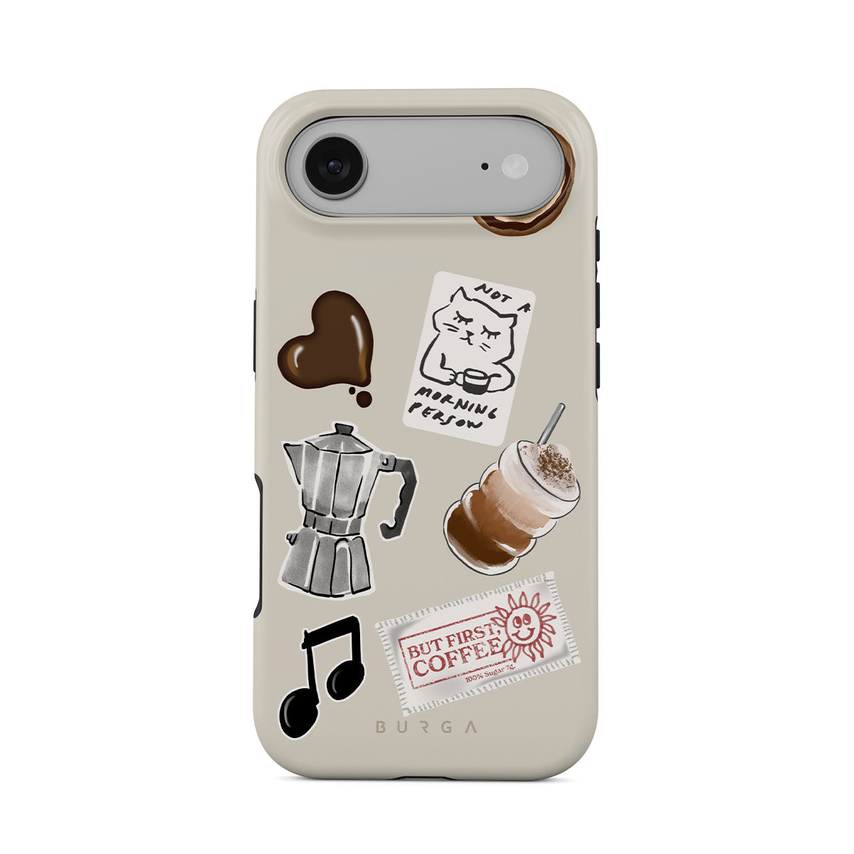 This design features: moka pot, frappe, cinnamon roll, chocolate heart, "Not a morning person" sticker, "But First, Coffee" receipt, music note