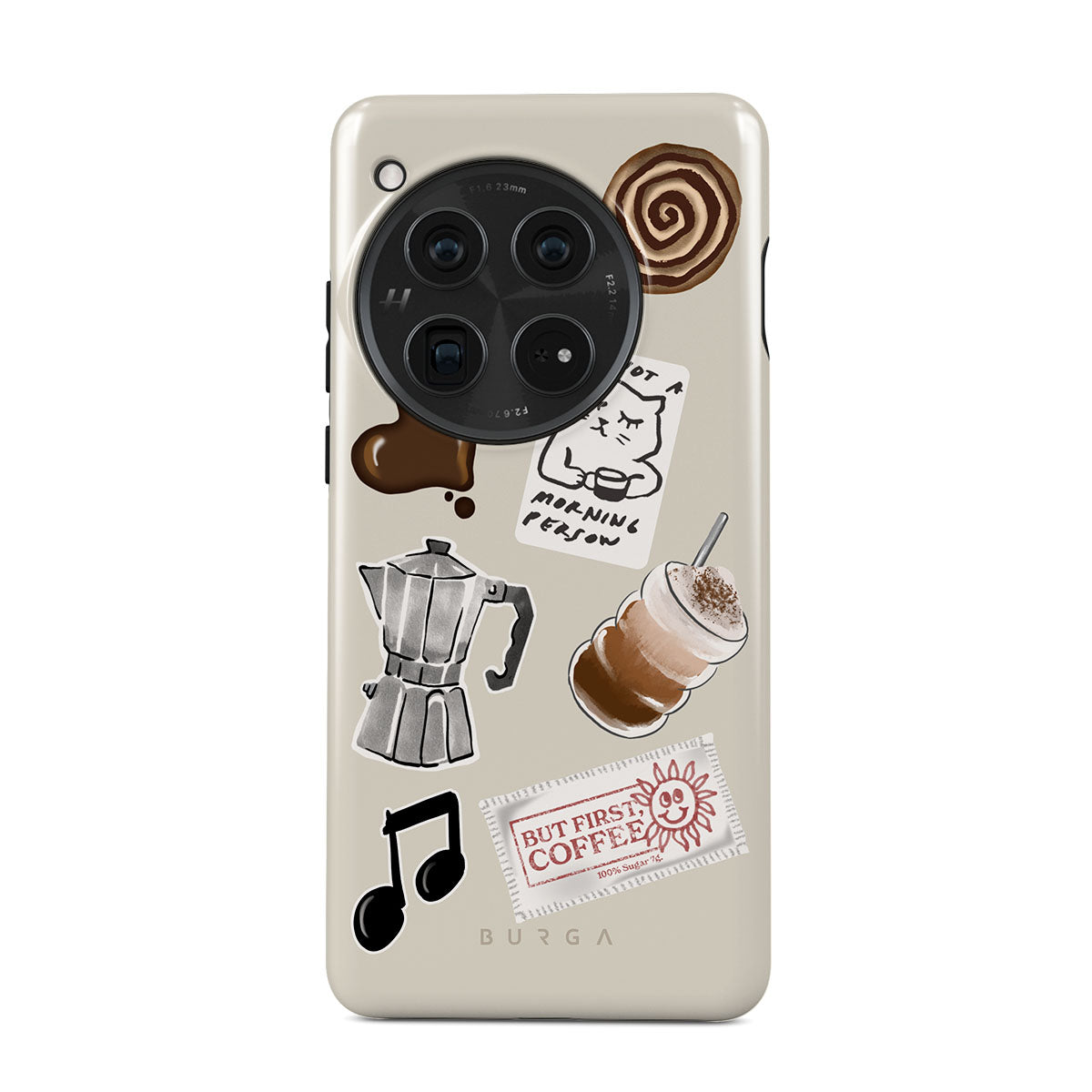 This design features: moka pot, frappe, cinnamon roll, chocolate heart, "Not a morning person" sticker, "But First, Coffee" receipt, music note