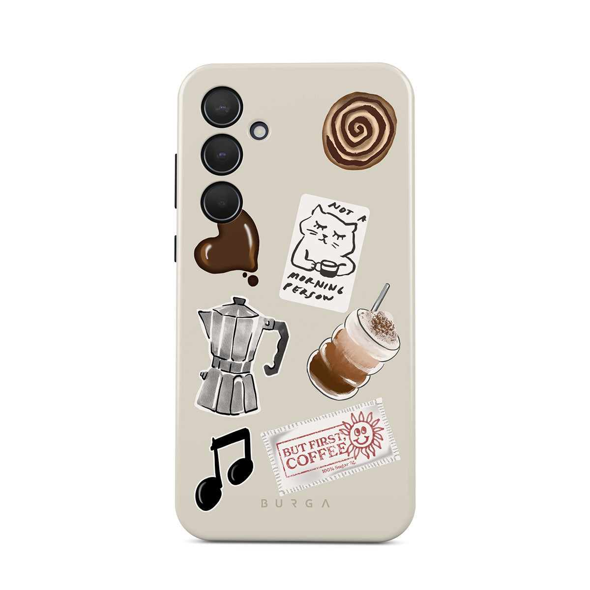 This design features: moka pot, frappe, cinnamon roll, chocolate heart, "Not a morning person" sticker, "But First, Coffee" receipt, music note