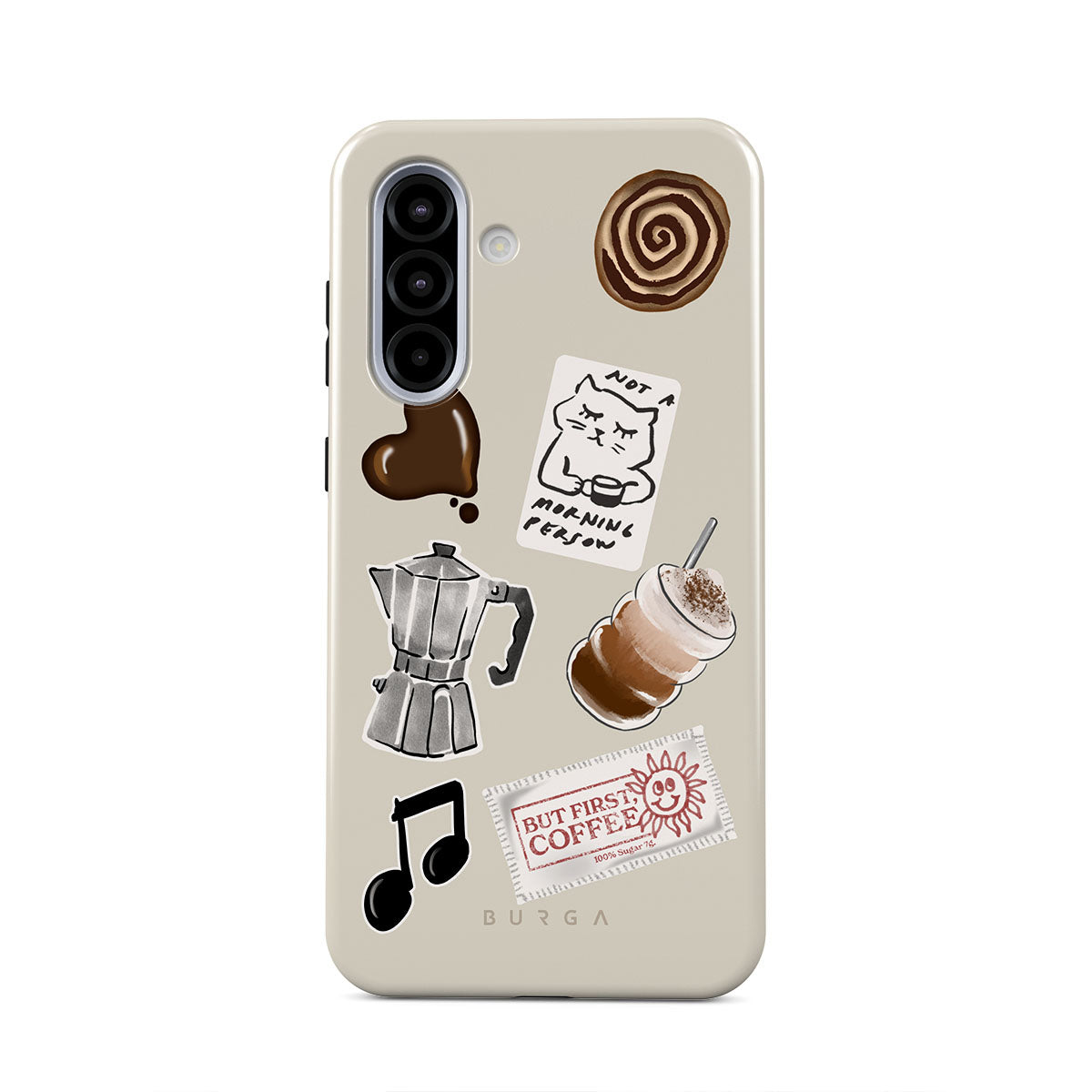 This design features: moka pot, frappe, cinnamon roll, chocolate heart, "Not a morning person" sticker, "But First, Coffee" receipt, music note