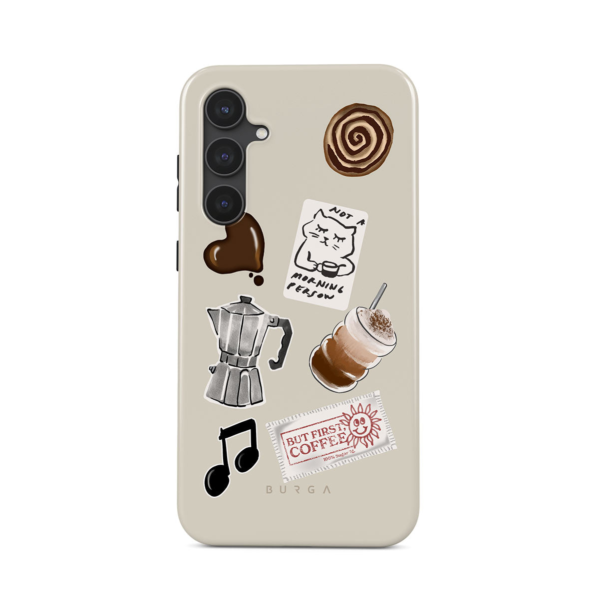 This design features: moka pot, frappe, cinnamon roll, chocolate heart, "Not a morning person" sticker, "But First, Coffee" receipt, music note