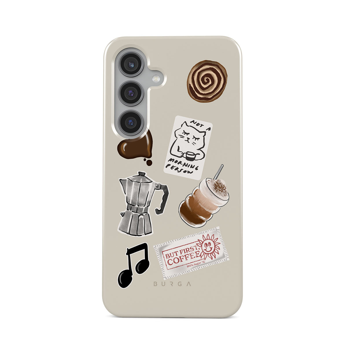 This design features: moka pot, frappe, cinnamon roll, chocolate heart, "Not a morning person" sticker, "But First, Coffee" receipt, music note