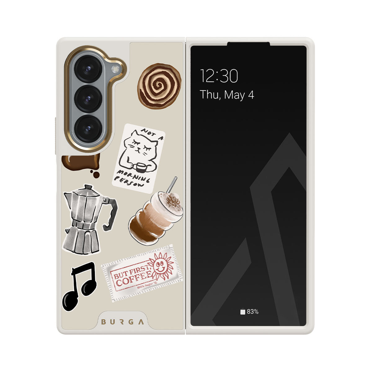 This design features: moka pot, frappe, cinnamon roll, chocolate heart, "Not a morning person" sticker, "But First, Coffee" receipt, music note