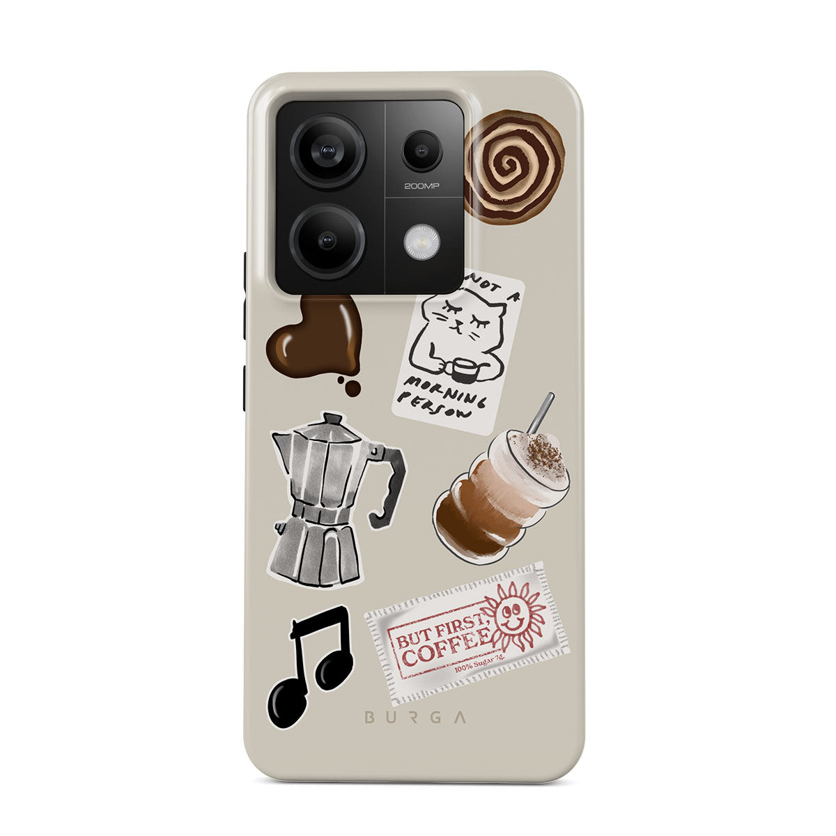 This design features: moka pot, frappe, cinnamon roll, chocolate heart, "Not a morning person" sticker, "But First, Coffee" receipt, music note