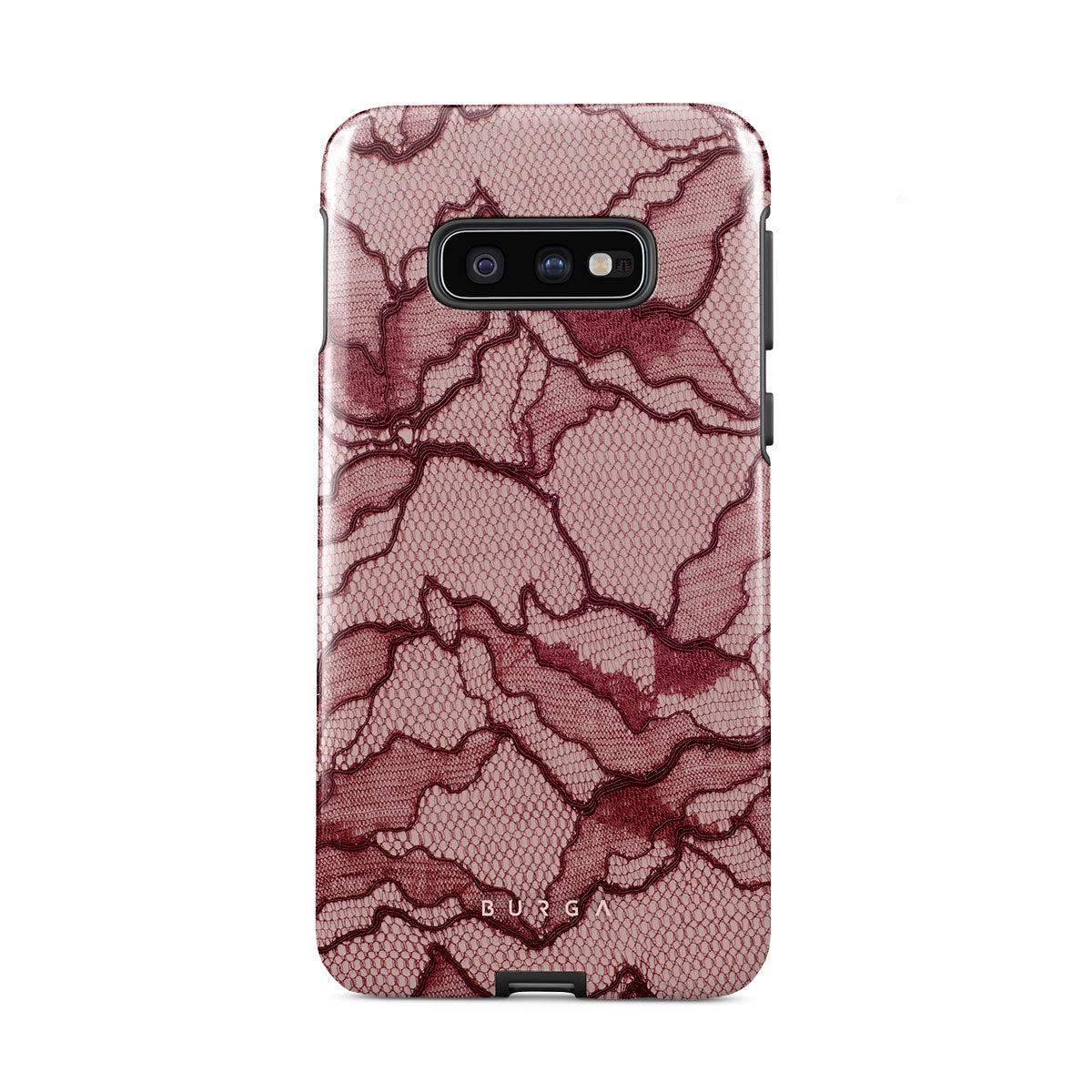 Channel your inner power with our Office Siren Samsung Galaxy S10E phone case design. A soft rosé backdrop and dark pink lace blend elegance and boldness, perfect for those who make quiet yet undeniable statements with confidence.