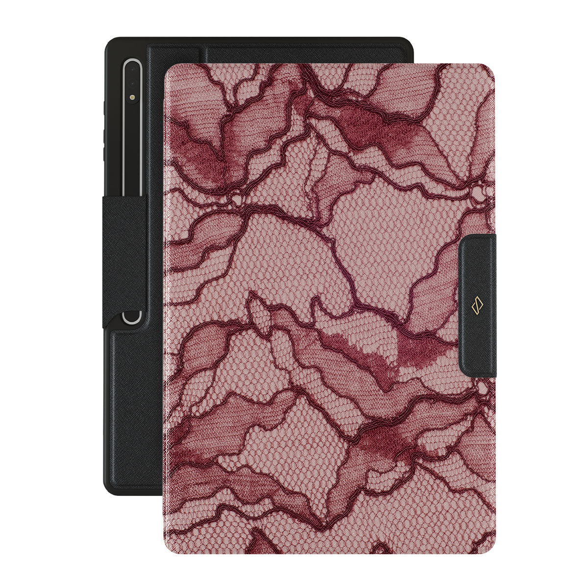 Channel your inner power with our Office Siren Samsung Galaxy Tab S8 Ultra folio case design. A soft rosé backdrop and dark pink lace blend elegance and boldness, perfect for those who make quiet yet undeniable statements with confidence.