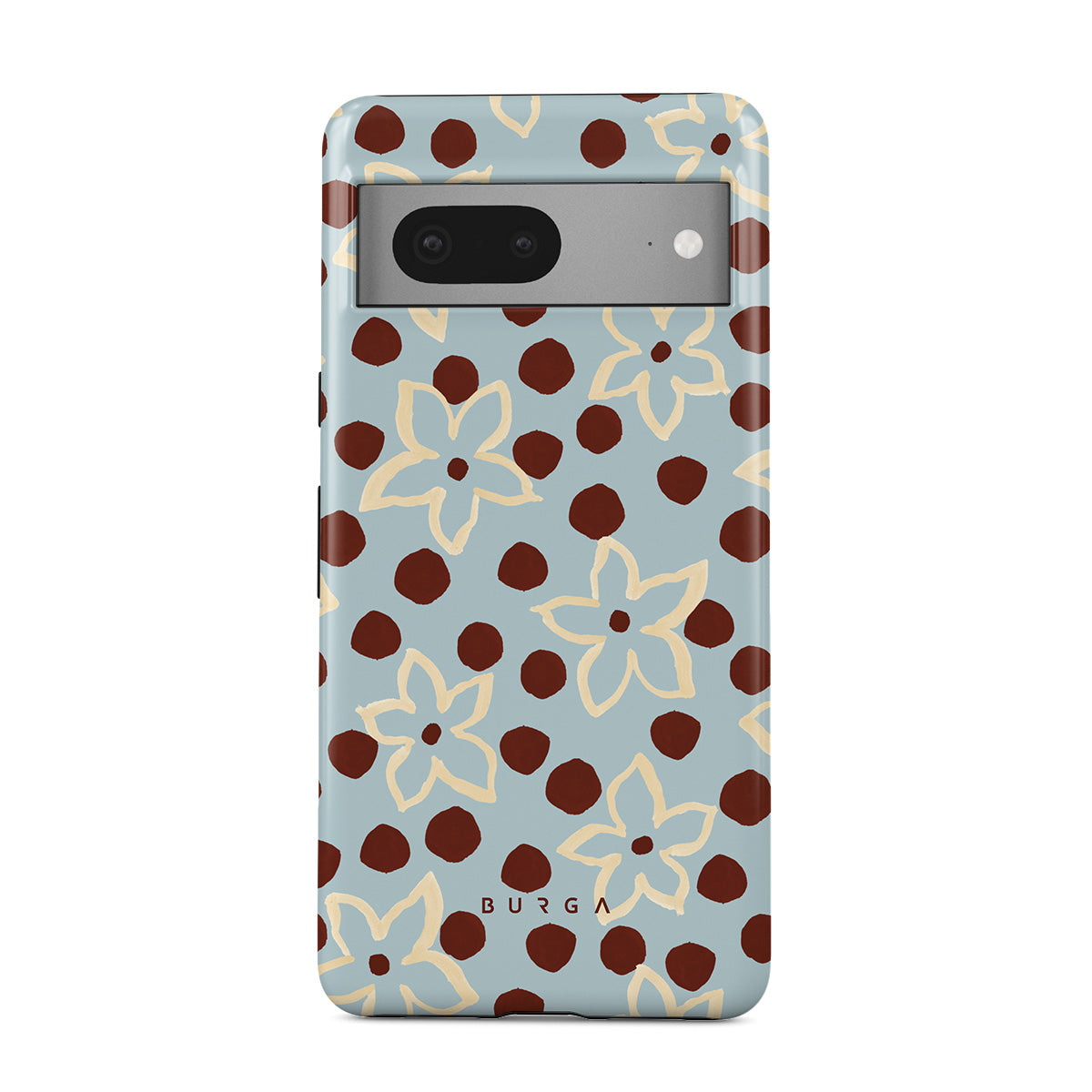 The Frutaria Google Pixel 7 phone case design design: retro surf motel wallpaper meets vintage ceramics. The soft florals, earthy dots, and cool-toned palette give major “forgotten seaside town in the ‘70s” energy.