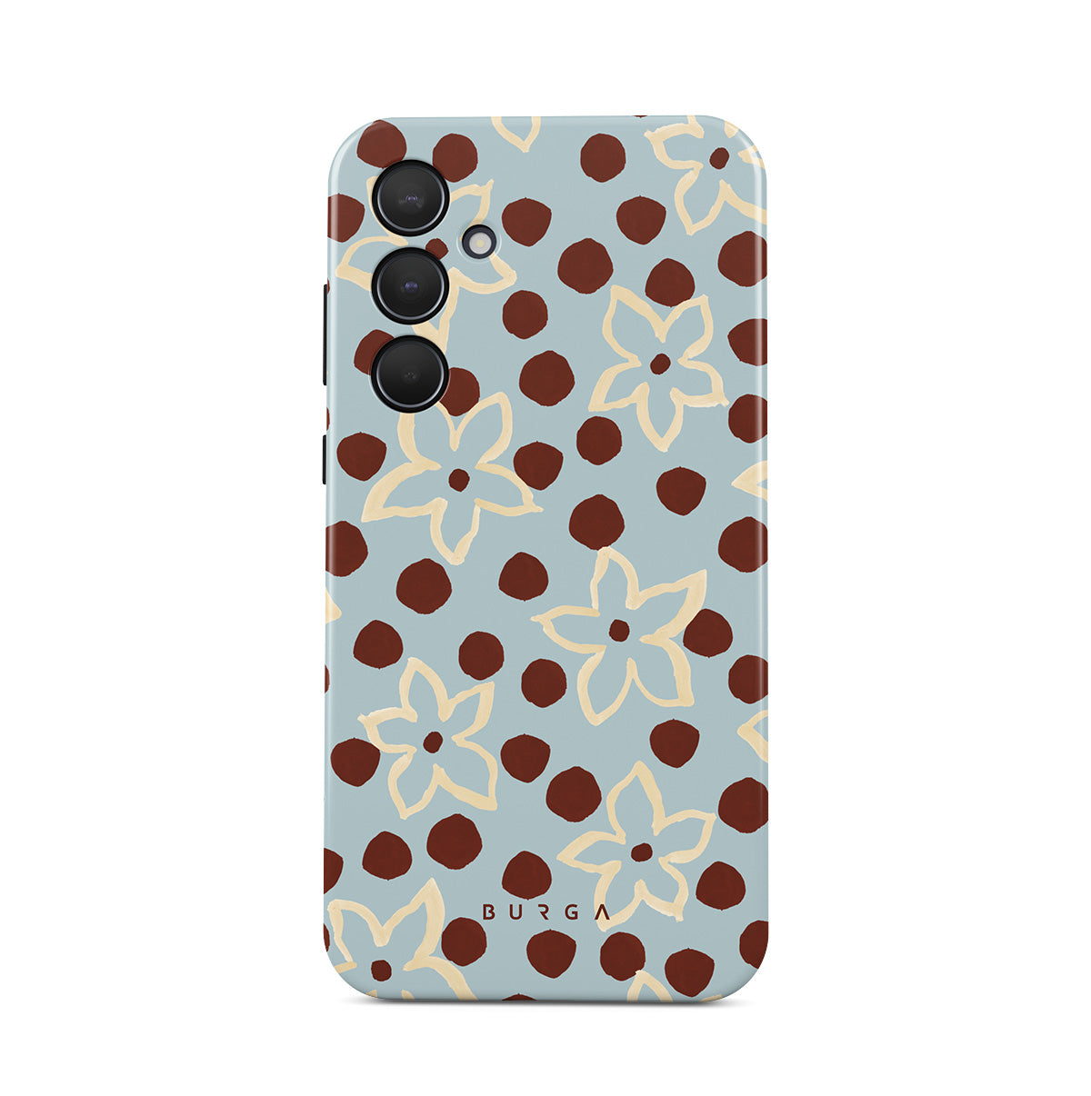 The Frutaria Samsung Galaxy A35 phone case design design: retro surf motel wallpaper meets vintage ceramics. The soft florals, earthy dots, and cool-toned palette give major “forgotten seaside town in the ‘70s” energy.