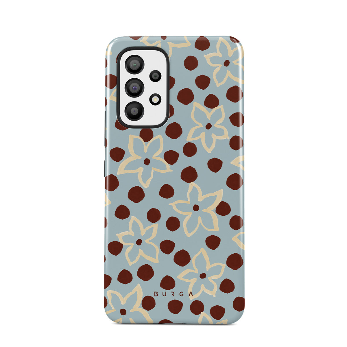 The Frutaria Samsung Galaxy A53 phone case design design: retro surf motel wallpaper meets vintage ceramics. The soft florals, earthy dots, and cool-toned palette give major “forgotten seaside town in the ‘70s” energy.