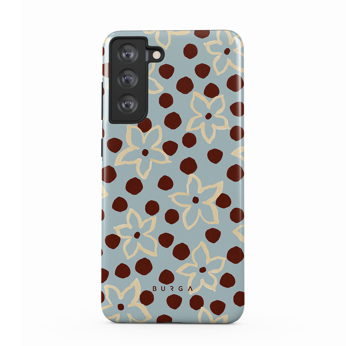 The Frutaria Samsung Galaxy S21 FE phone case design design: retro surf motel wallpaper meets vintage ceramics. The soft florals, earthy dots, and cool-toned palette give major “forgotten seaside town in the ‘70s” energy.