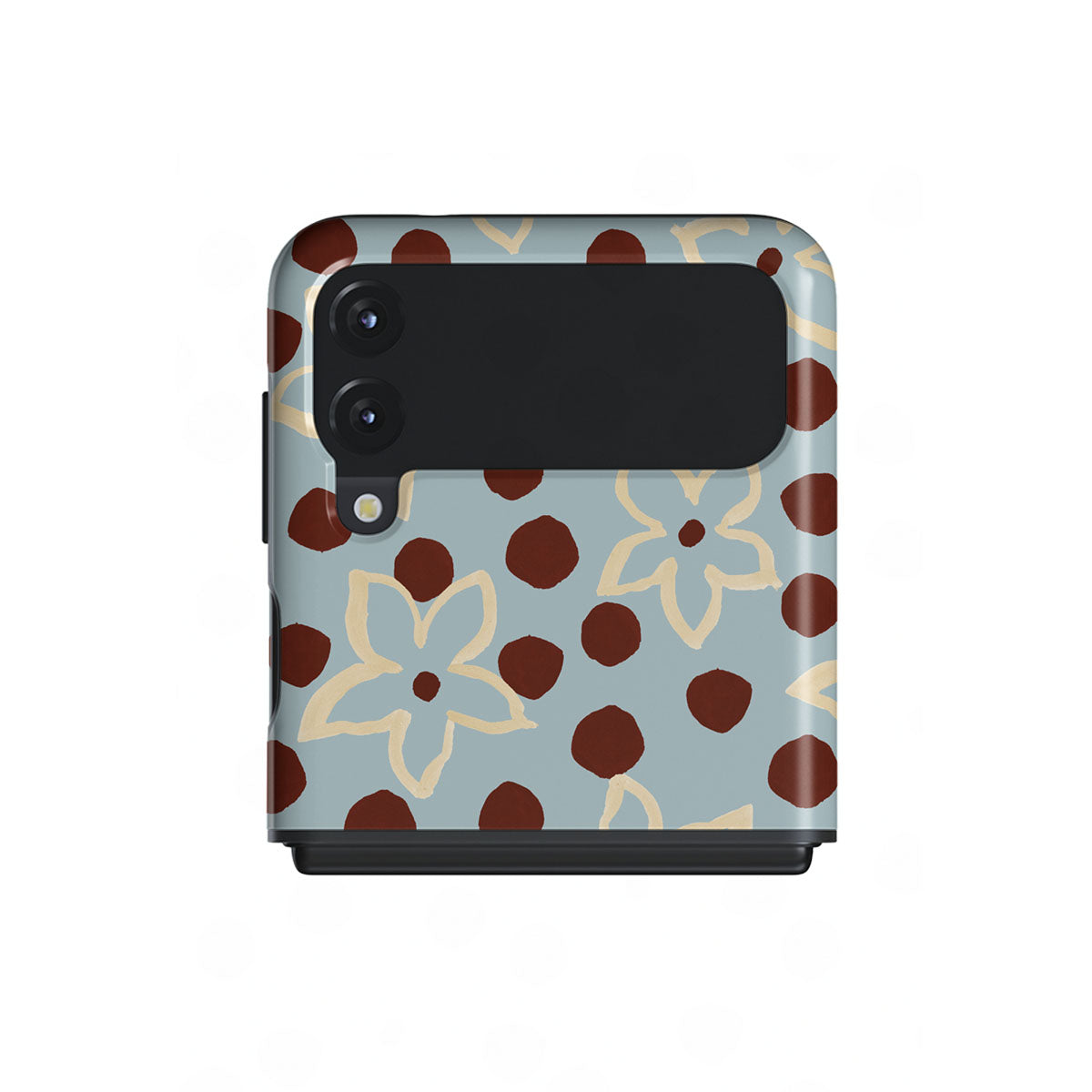 The Frutaria Samsung Galaxy Z Flip 3 phone case design design: retro surf motel wallpaper meets vintage ceramics. The soft florals, earthy dots, and cool-toned palette give major “forgotten seaside town in the ‘70s” energy.