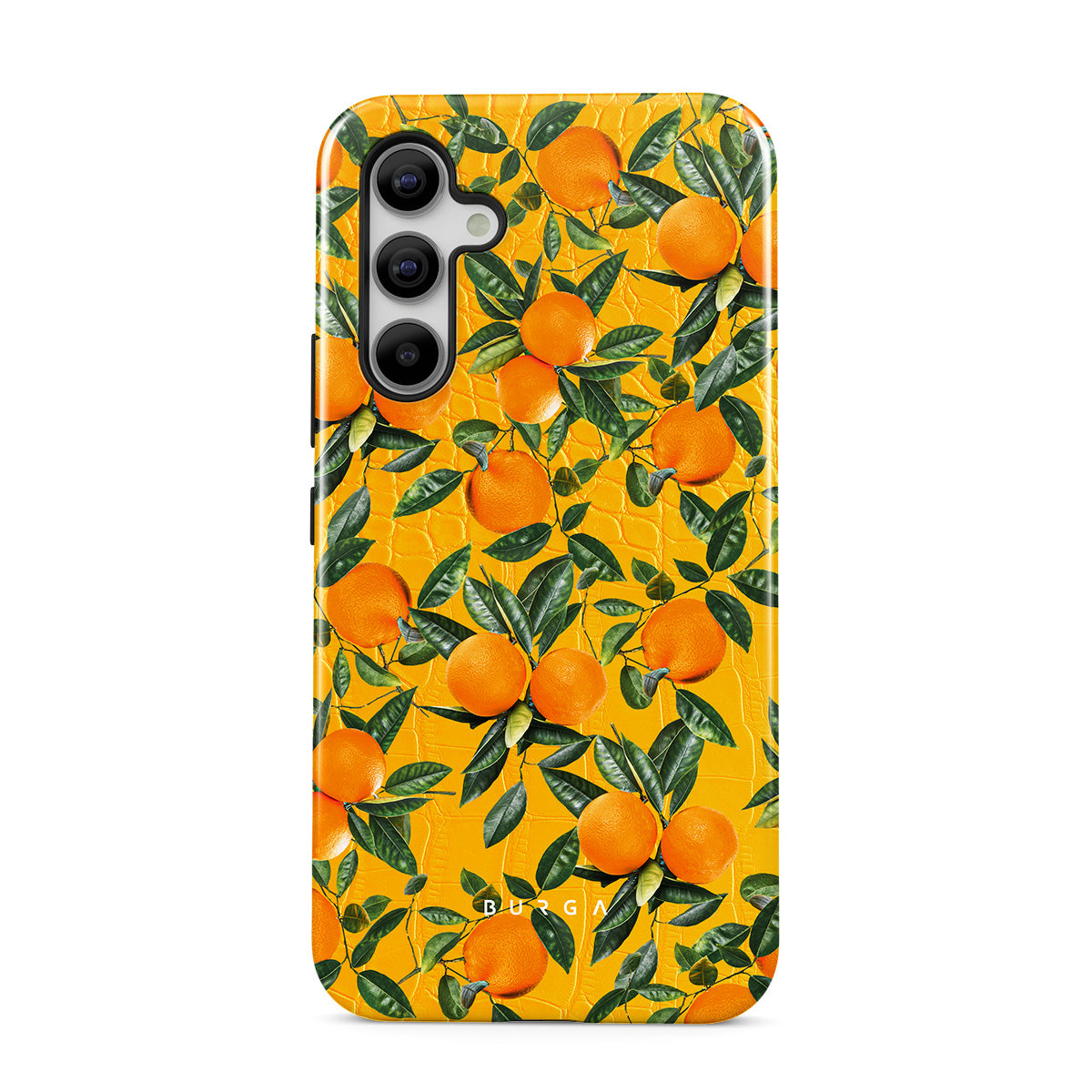 Orange Lemonade Samsung Galaxy A55 phone case showcases a unique combination of vibrant orange croco design with plenty of mouth-watering oranges on top. With this energetic design, protect your phone and keep your spirits up.