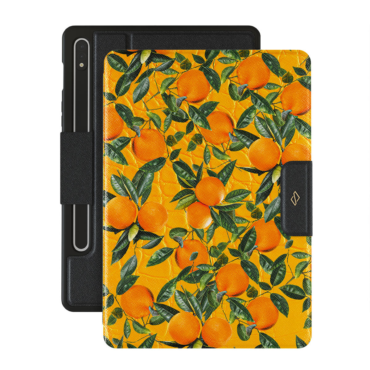 Orange Lemonadeit is a printed pattern * Samsung Galaxy Tab S8+/S7+/S7 FE folio case showcases a unique combination of vibrant orange croco design with plenty of mouth-watering oranges on top. With this energetic design, protect your Galaxy Tab and keep your spirits up.