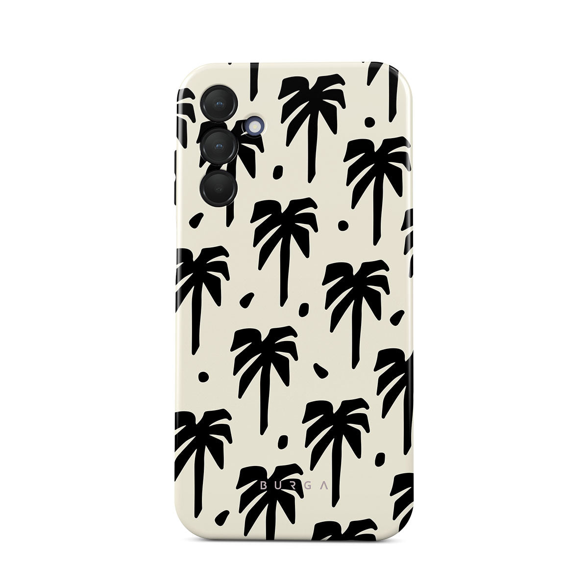 A peaceful haven right at your fingertips. The design contrasts black palm silhouettes against a calming light backdrop. Our Paraíso Samsung Galaxy A15 4G / 5G phone case is your passport to an everlasting tropical escape.