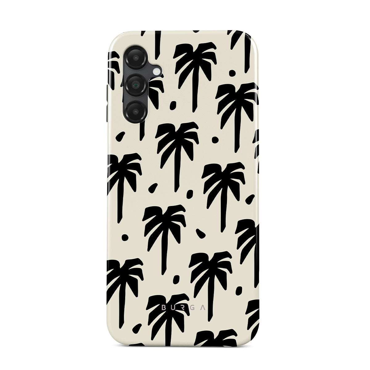 A peaceful haven right at your fingertips. The design contrasts black palm silhouettes against a calming light backdrop. Our Paraíso Samsung Galaxy A25 phone case is your passport to an everlasting tropical escape.
