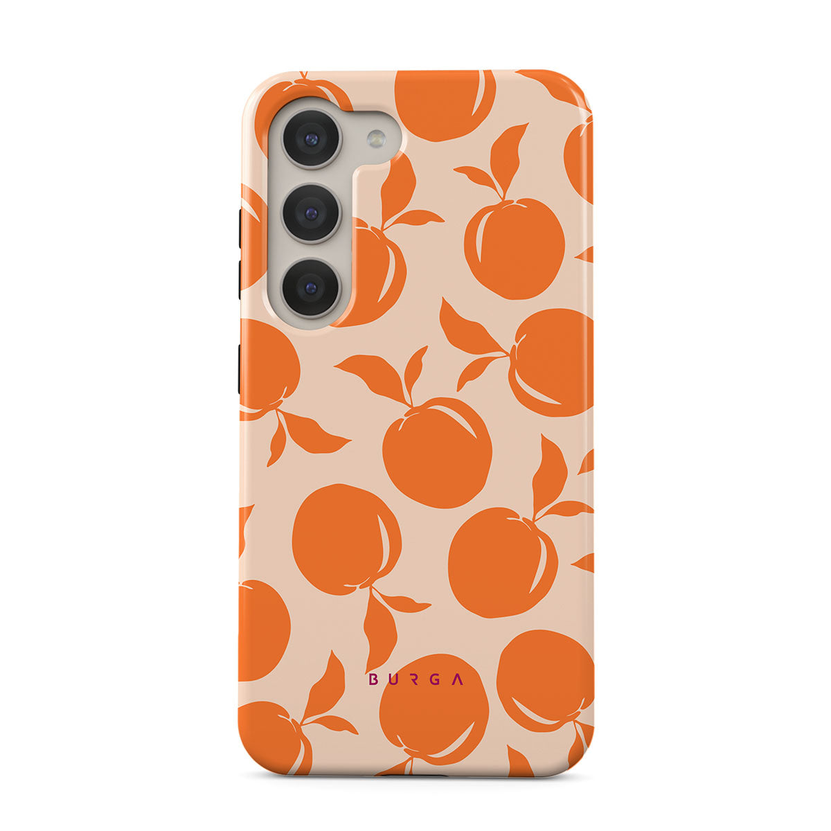Picture a sun-soaked grove where ripe, juicy peaches glow with a radiant orange vibrance, their succulent aroma filling the warm air. Our Peach Fuzz design infuses your Samsung Galaxy S23 phone case with a lively, sun-kissed charm, perfectly capturing the essence of carefree, joyful summer days.
