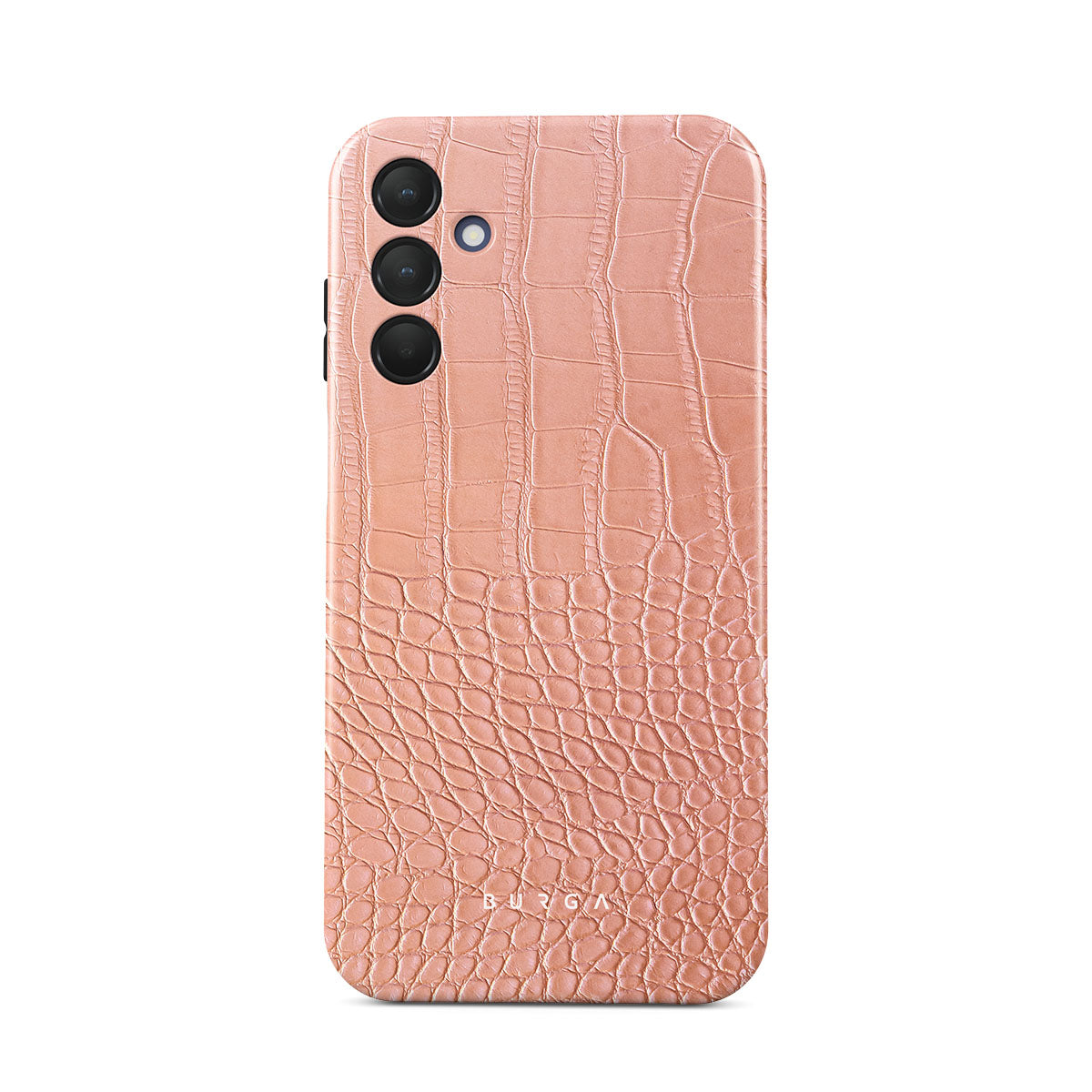 Our Pink Croco Samsung Galaxy A51 phone case features a classic crocodile design reimagined and showcased in a soft coral shade. The new take on the dangerous animal print will add a touch of softness to your style while simultaneously offering heavy-duty protection to your device.