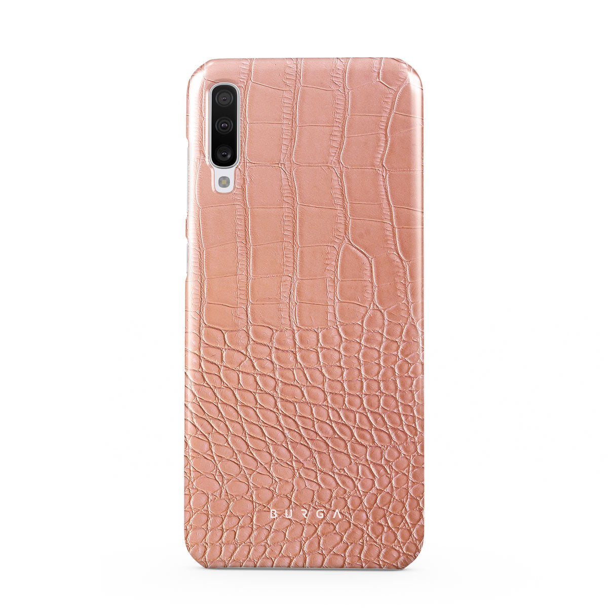 Our Pink Croco Samsung Galaxy A70 phone case features a classic crocodile design reimagined and showcased in a soft coral shade. The new take on the dangerous animal print will add a touch of softness to your style while simultaneously offering heavy-duty protection to your device.