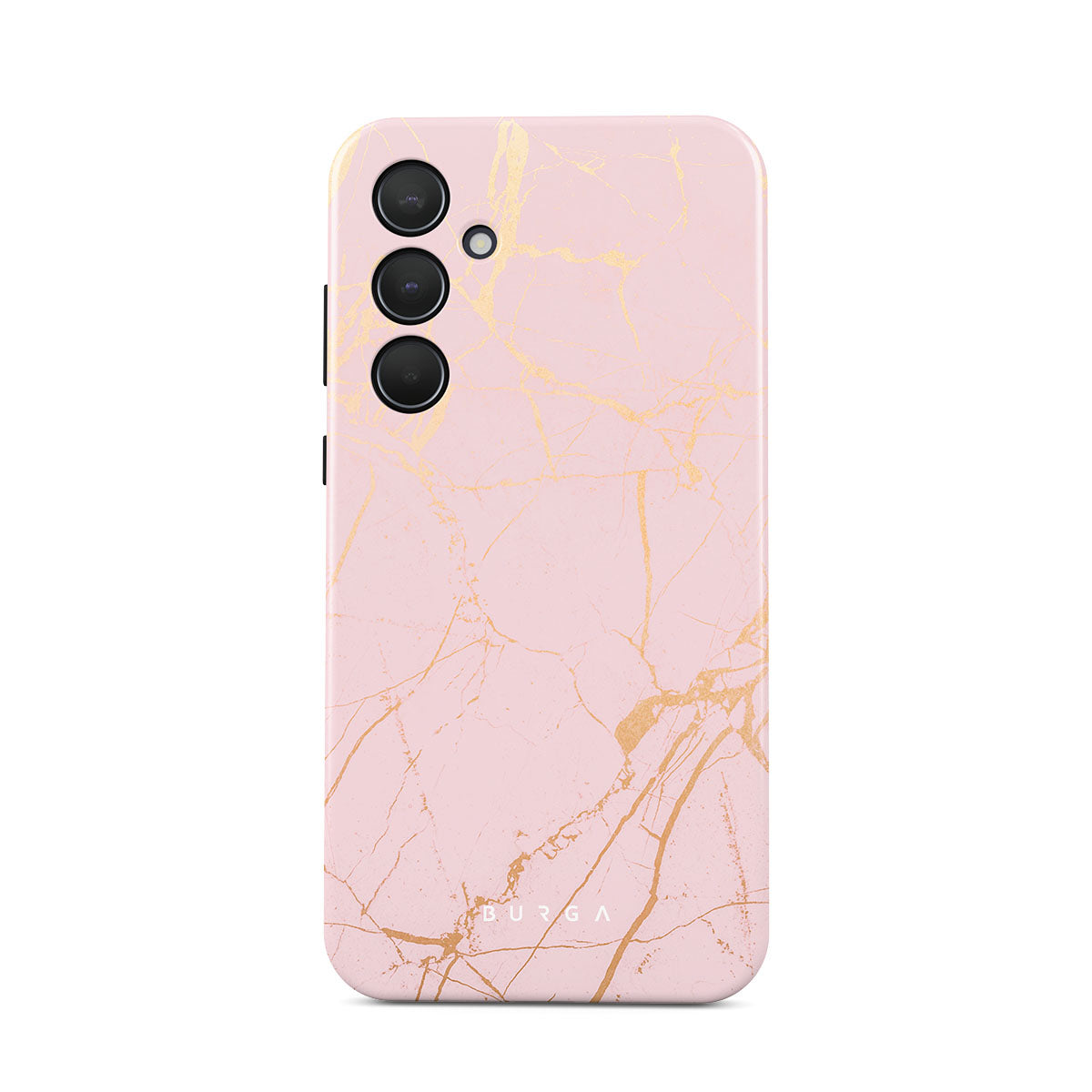 Growing under the beautiful sky and warmed by the rays of the sunshine, when ripped, peach offers you sweetness and softness. This is why our Peachy Gold Samsung Galaxy A51 phone case design adds a bit of golden color to the pink marble dream making a protective phone case both pretty and durable.