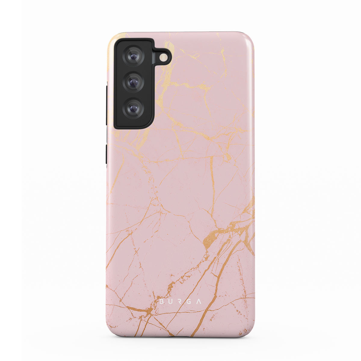 Growing under the beautiful sky and warmed by the rays of the sunshine, when ripped, peach offers you sweetness and softness. This is why our Peachy Gold Samsung Galaxy S21 FE phone case design adds a bit of golden color to the pink marble dream making a protective phone case both pretty and durable.