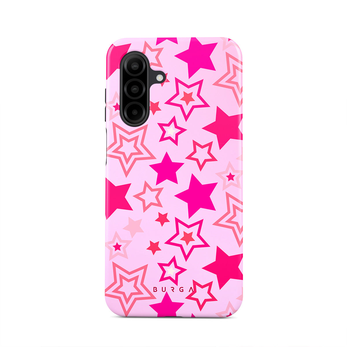 Buckle up for a starry ride, and let's twirl under the Plastic Sky. Neon stars shimmering across a cheeky rose-tinted galaxy create a playful space-disco atmosphere. Be the center of the universe with our Plastic Sky Samsung Galaxy A26 5G phone case!