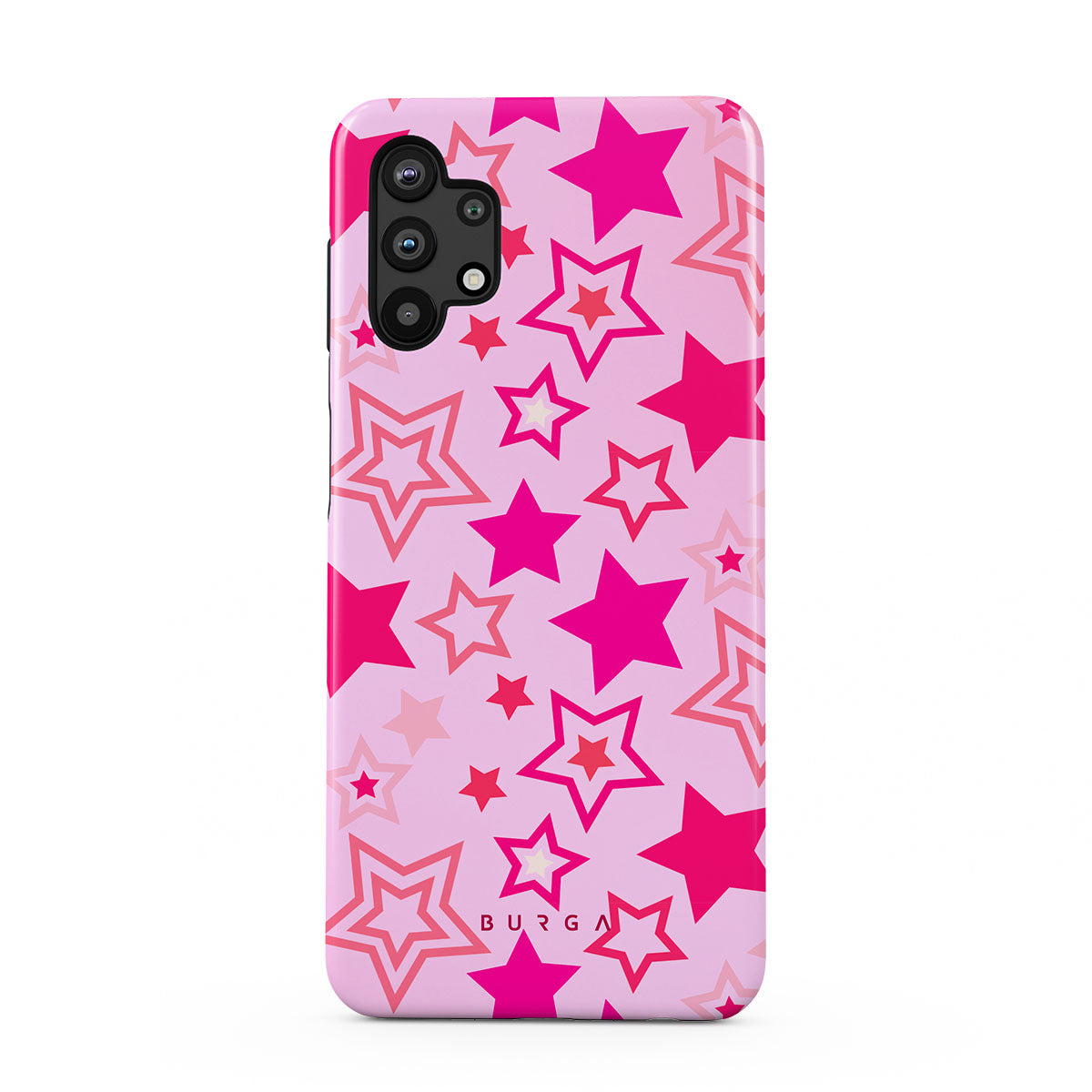 Buckle up for a starry ride, and let's twirl under the Plastic Sky. Neon stars shimmering across a cheeky rose-tinted galaxy create a playful space-disco atmosphere. Be the center of the universe with our Plastic Sky Samsung Galaxy A32 5G phone case!