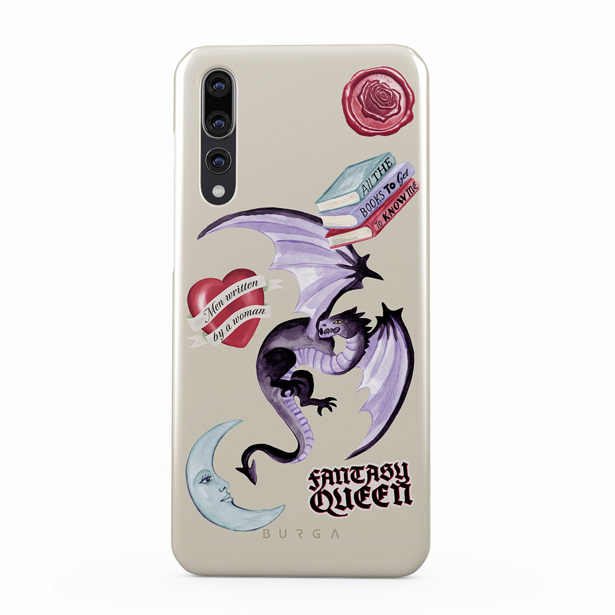 This design features: purple dragon, "Fantasy Queen" sticker, crescent moon, purple wax seal, heart with message, books