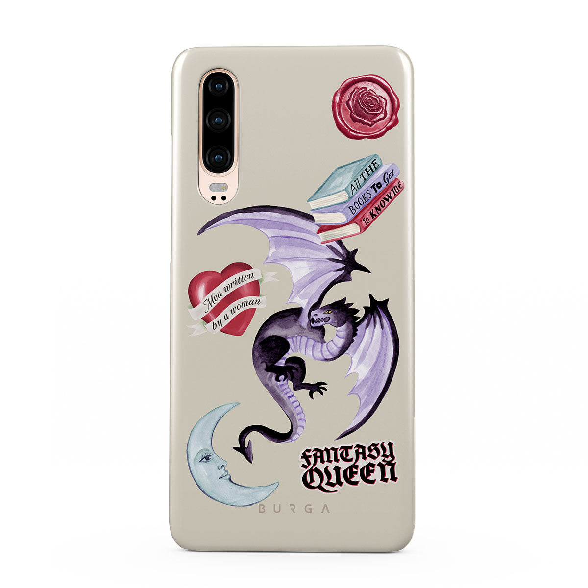 This design features: purple dragon, "Fantasy Queen" sticker, crescent moon, purple wax seal, heart with message, books