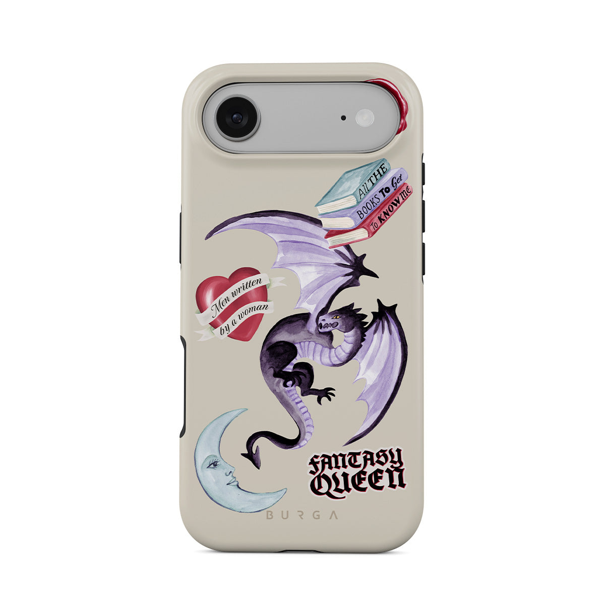 This design features: purple dragon, "Fantasy Queen" sticker, crescent moon, purple wax seal, heart with message, books