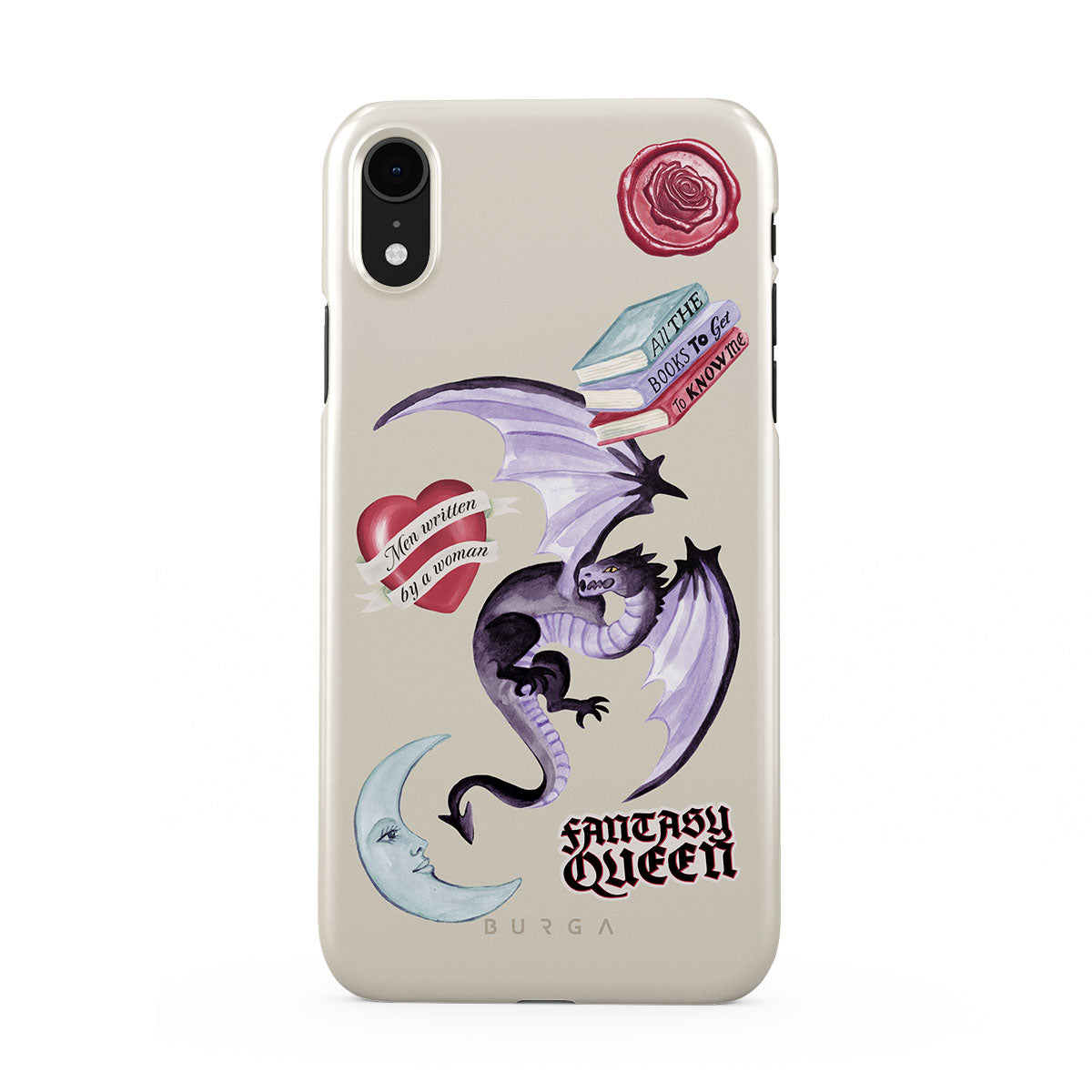 This design features: purple dragon, "Fantasy Queen" sticker, crescent moon, purple wax seal, heart with message, books