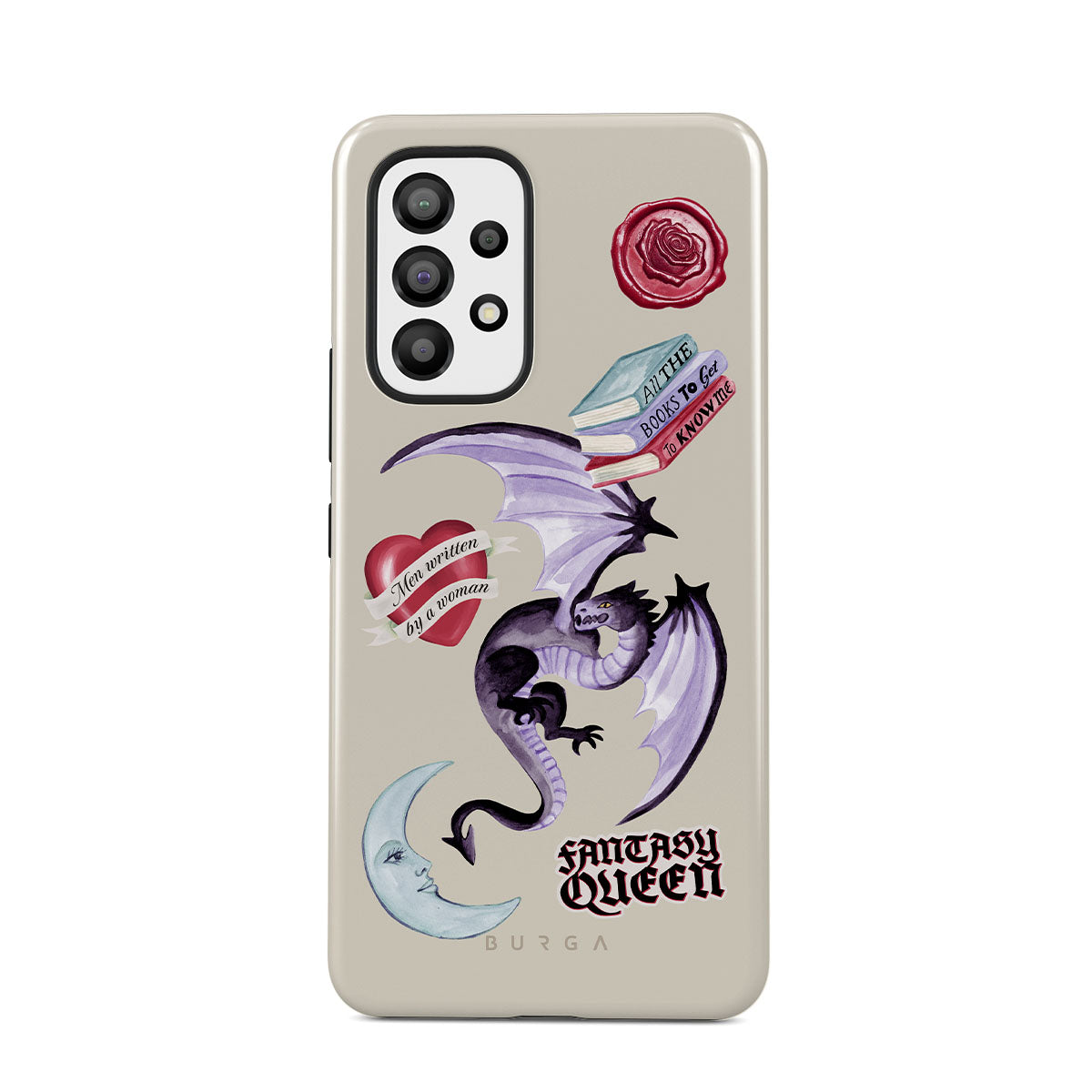 This design features: purple dragon, "Fantasy Queen" sticker, crescent moon, purple wax seal, heart with message, books