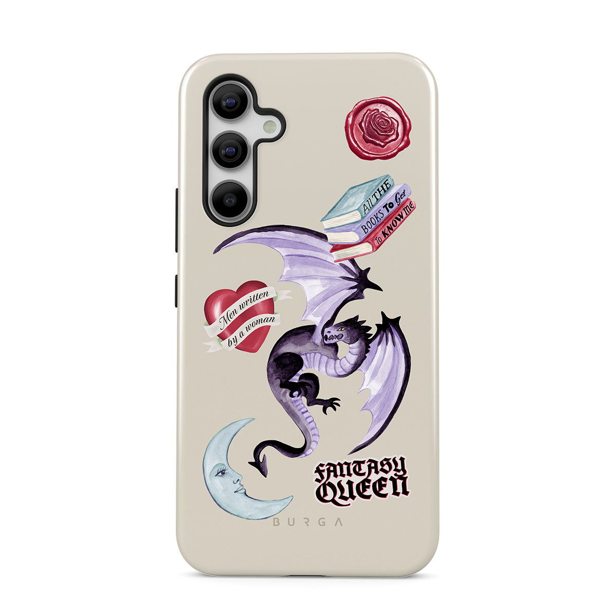 This design features: purple dragon, "Fantasy Queen" sticker, crescent moon, purple wax seal, heart with message, books