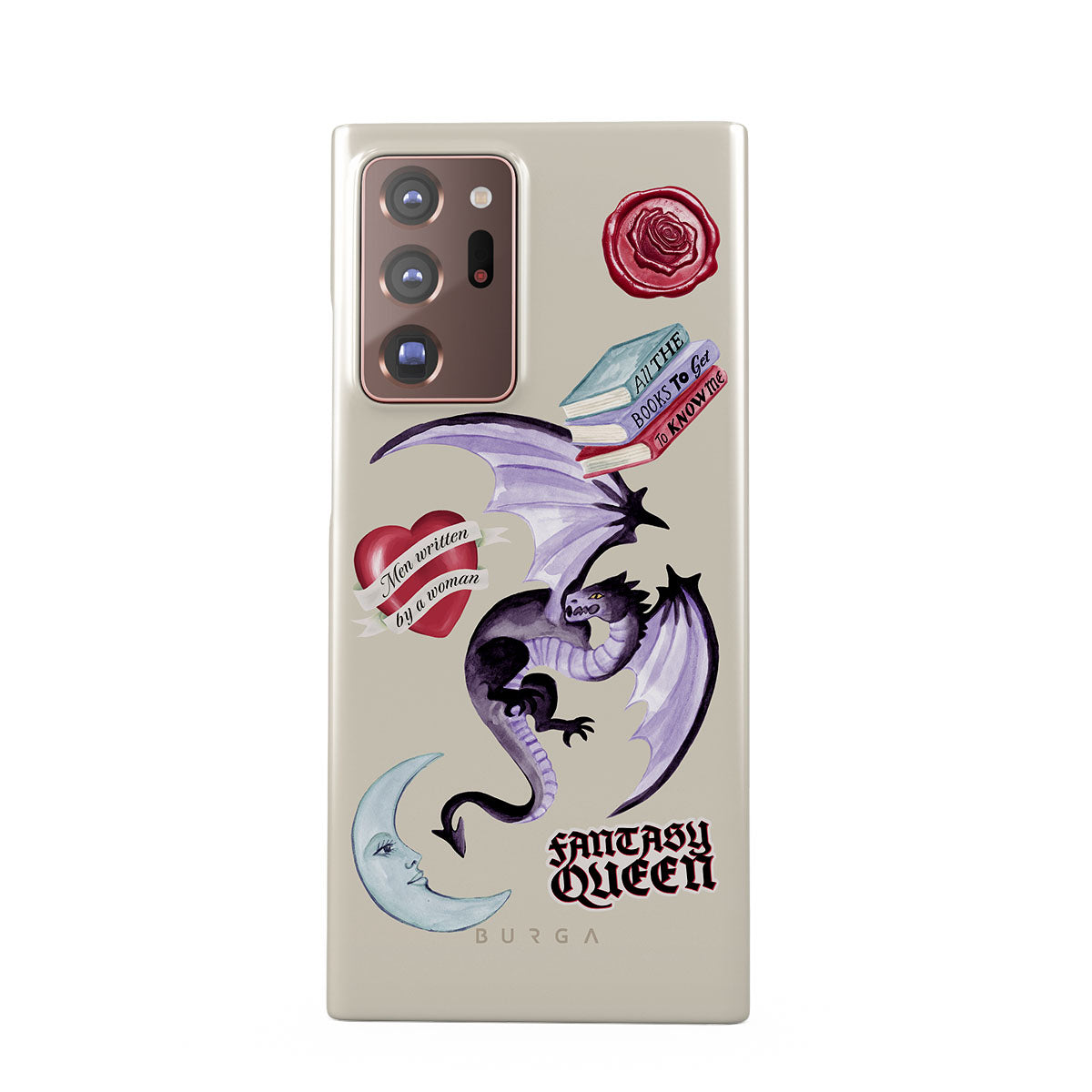 This design features: purple dragon, "Fantasy Queen" sticker, crescent moon, purple wax seal, heart with message, books