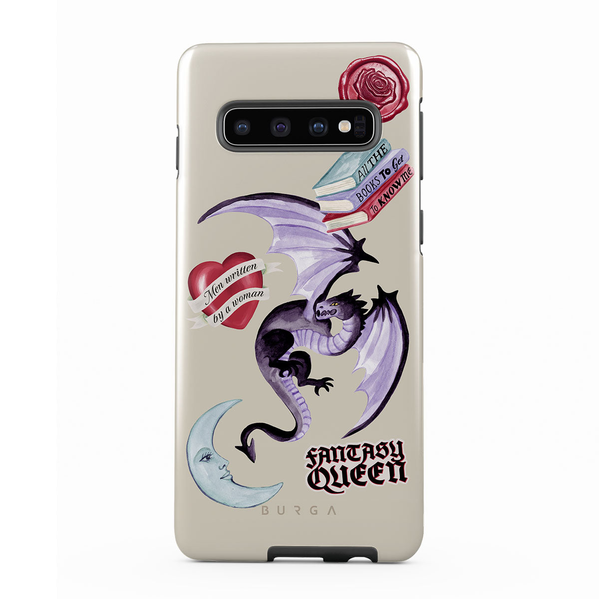 This design features: purple dragon, "Fantasy Queen" sticker, crescent moon, purple wax seal, heart with message, books