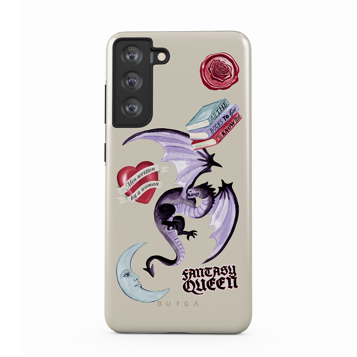 This design features: purple dragon, "Fantasy Queen" sticker, crescent moon, purple wax seal, heart with message, books