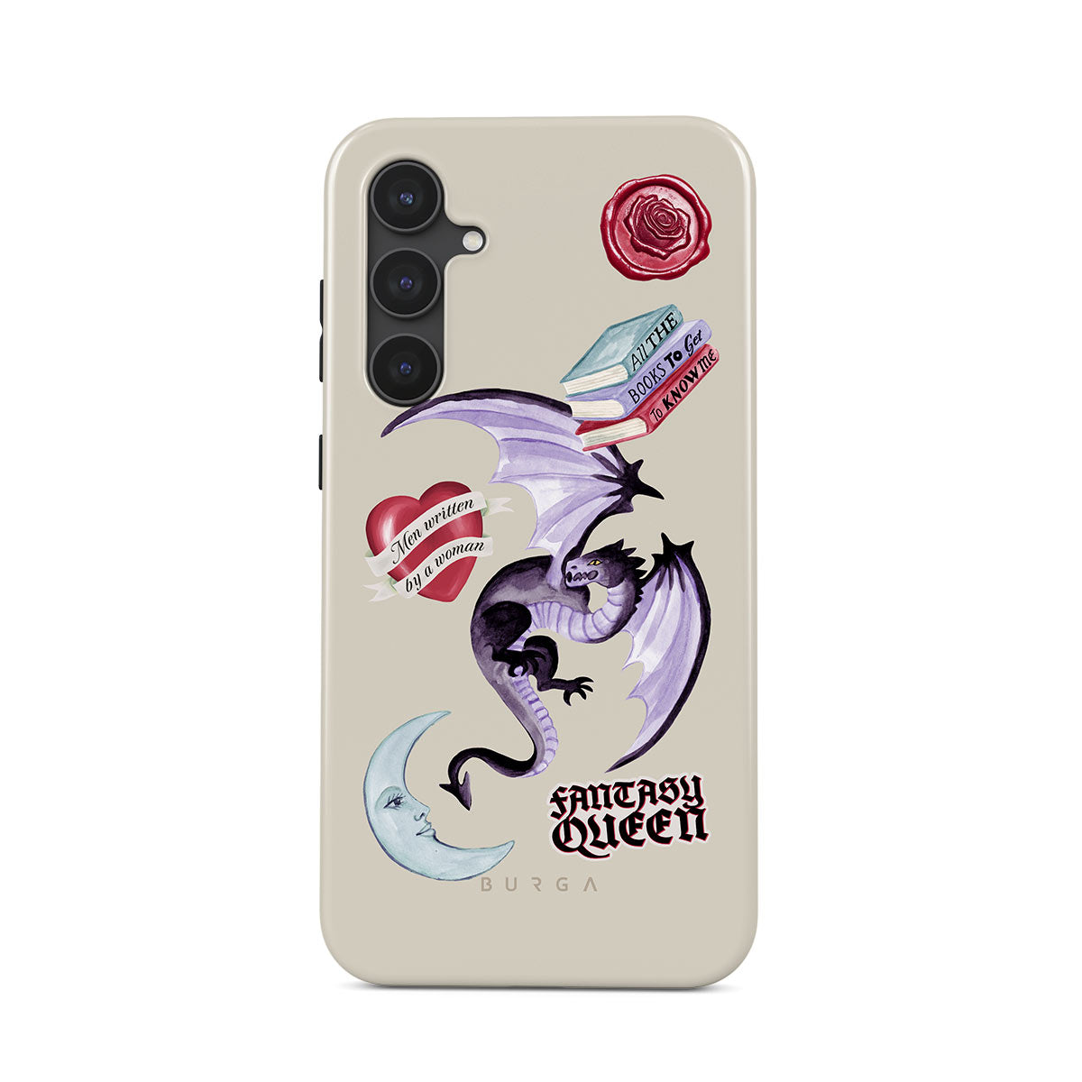 This design features: purple dragon, "Fantasy Queen" sticker, crescent moon, purple wax seal, heart with message, books