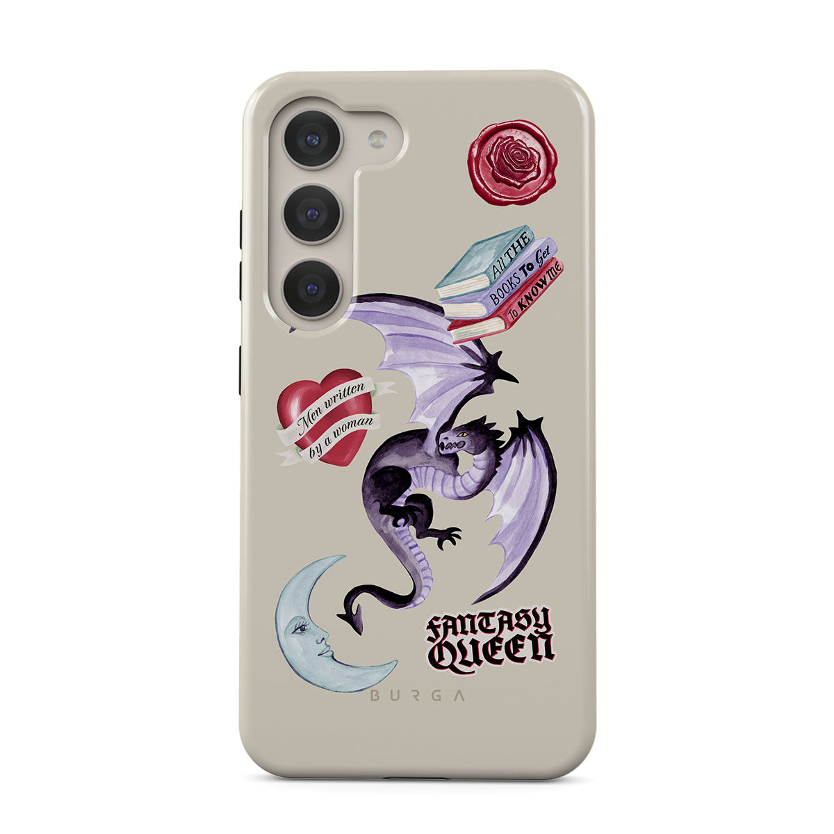 This design features: purple dragon, "Fantasy Queen" sticker, crescent moon, purple wax seal, heart with message, books