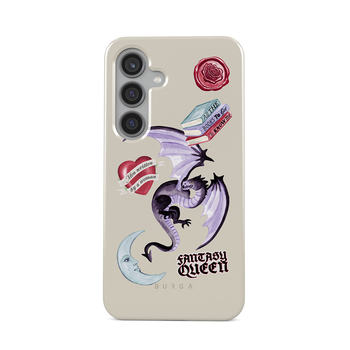 This design features: purple dragon, "Fantasy Queen" sticker, crescent moon, purple wax seal, heart with message, books