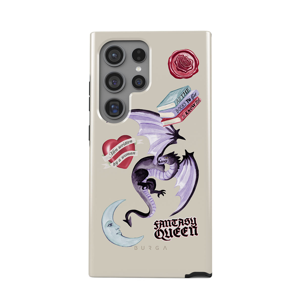 This design features: purple dragon, "Fantasy Queen" sticker, crescent moon, purple wax seal, heart with message, books
