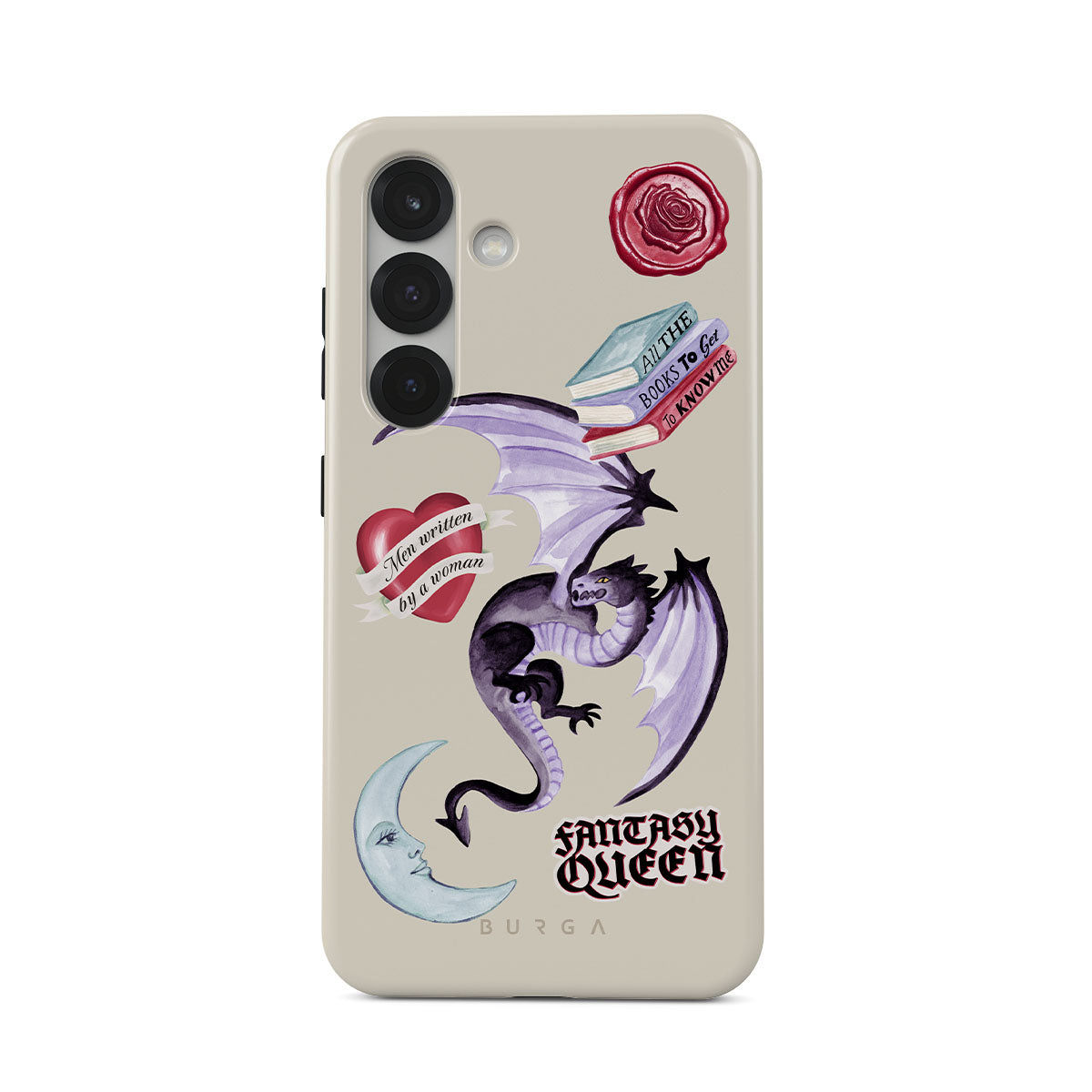 This design features: purple dragon, "Fantasy Queen" sticker, crescent moon, purple wax seal, heart with message, books