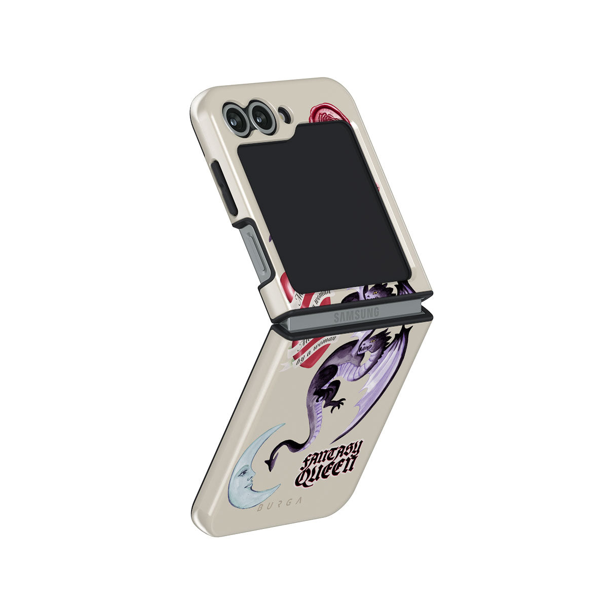 This design features: purple dragon, "Fantasy Queen" sticker, crescent moon, purple wax seal, heart with message, books