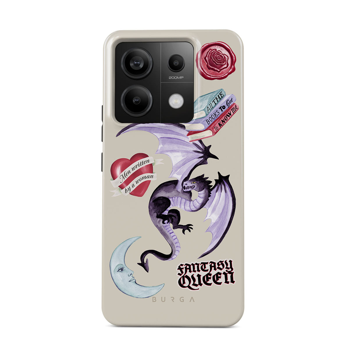 This design features: purple dragon, "Fantasy Queen" sticker, crescent moon, purple wax seal, heart with message, books