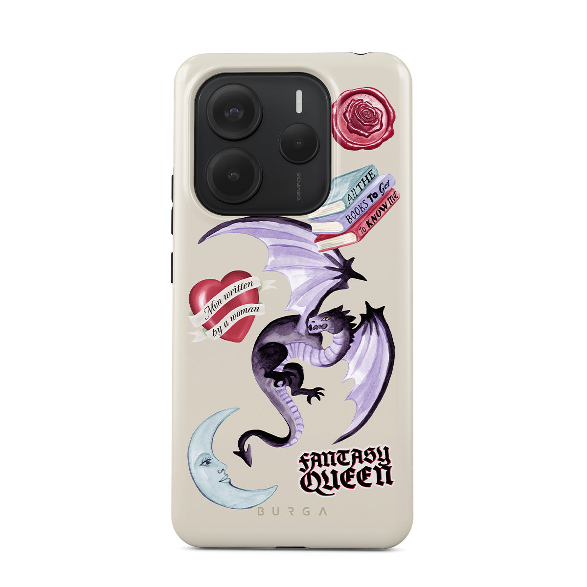 This design features: purple dragon, "Fantasy Queen" sticker, crescent moon, purple wax seal, heart with message, books