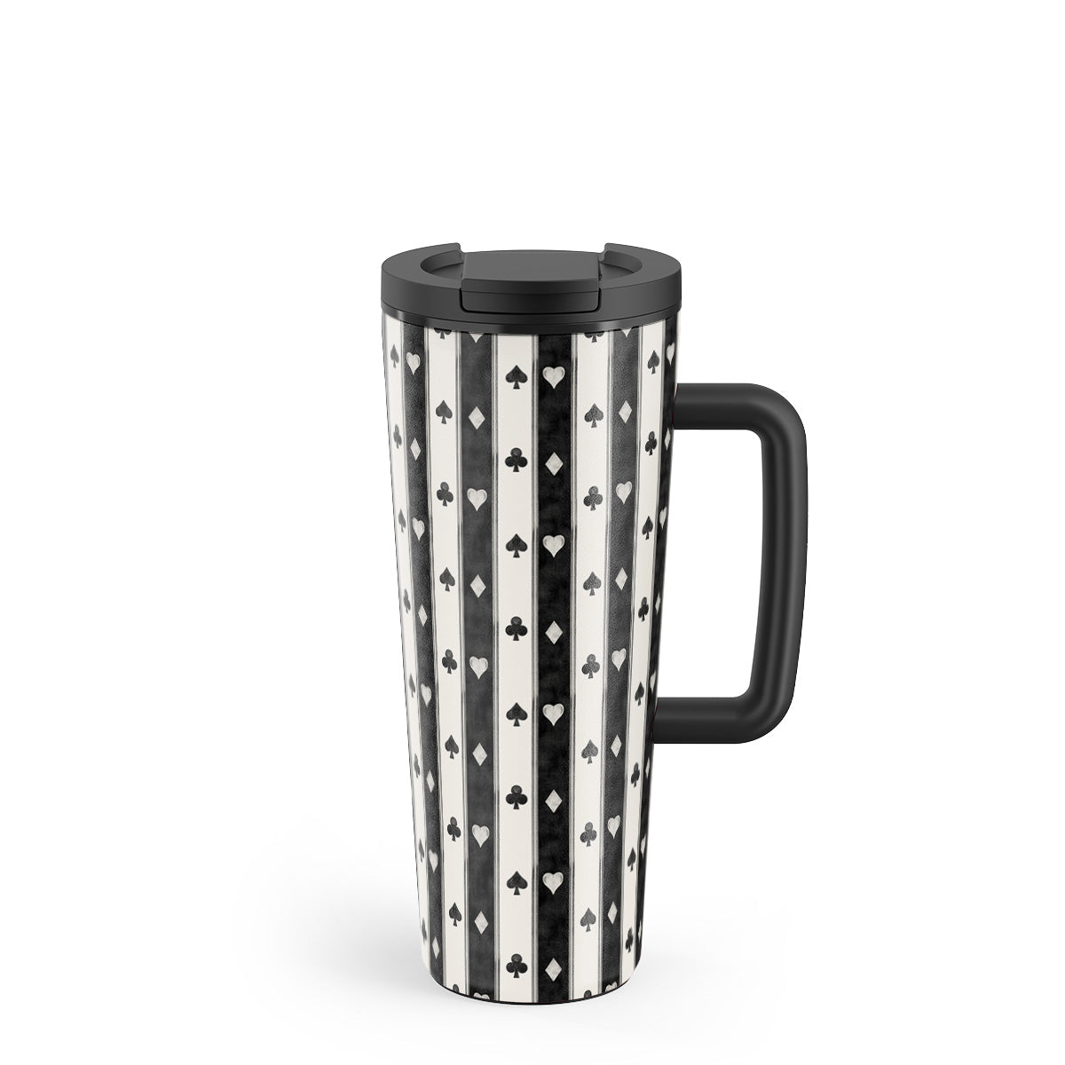 This design features: black and white stripes, hearts, playing card suits, vintage style
