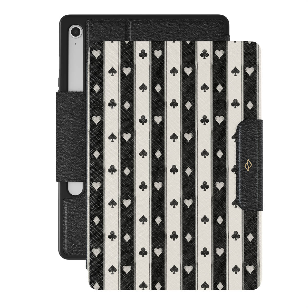 This design features: black and white stripes, hearts, playing card suits, vintage style