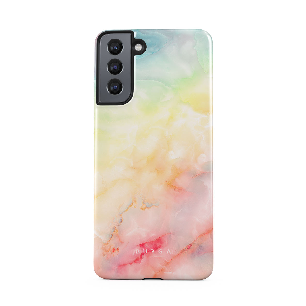 Color your world with our New Flame Samsung Galaxy S21 phone case. Inspired by the rainbow, this case is guaranteed to brighten your style. The dreamy pastel rainbow and the shockproof design of our case will keep your phone safe and sound while looking better than ever.