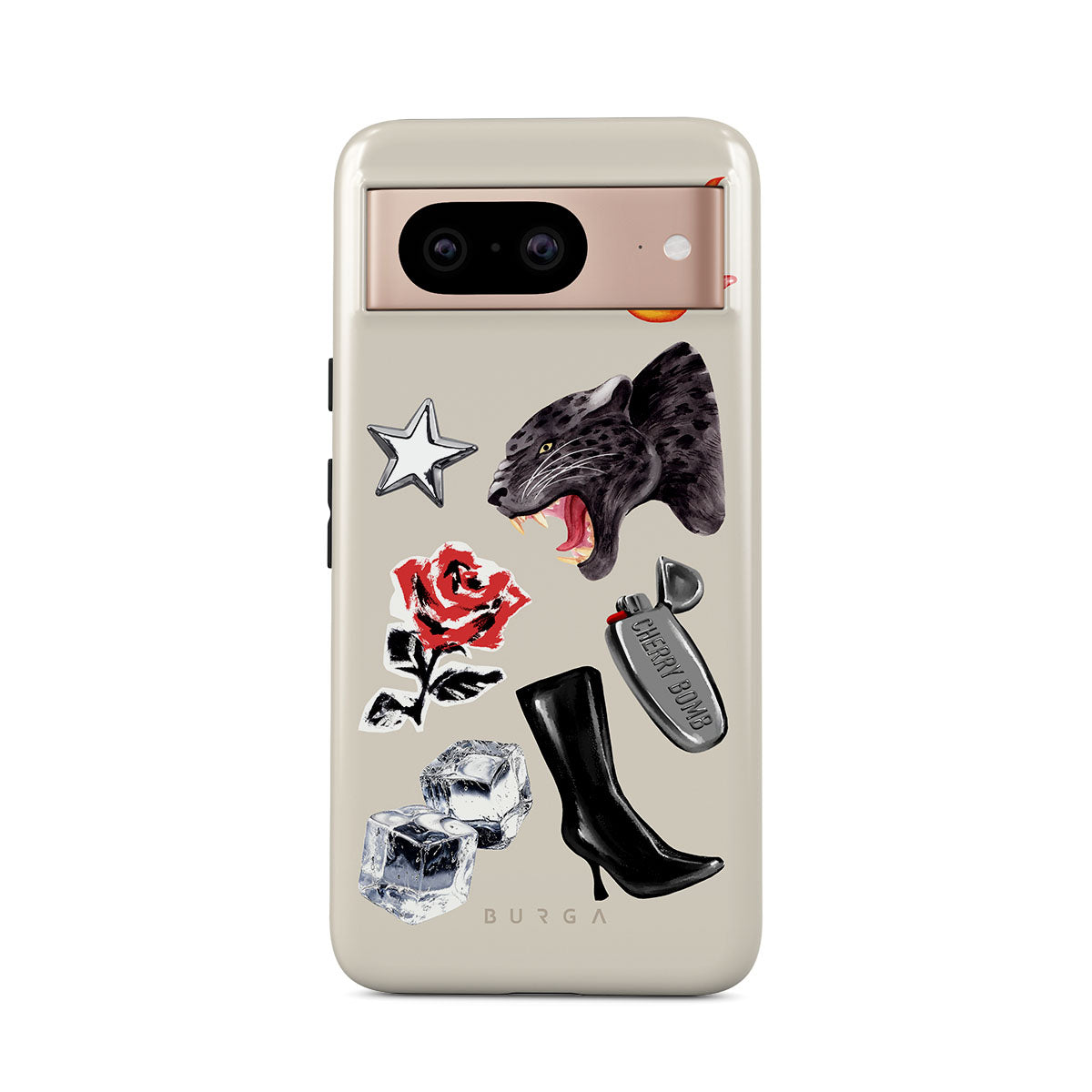 This design features: black panther, red rose, burning bell pepper, silver lighter, black knee-high boots, ice cubes, silver star
