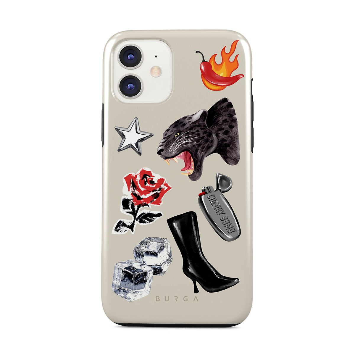 This design features: black panther, red rose, burning bell pepper, silver lighter, black knee-high boots, ice cubes, silver star