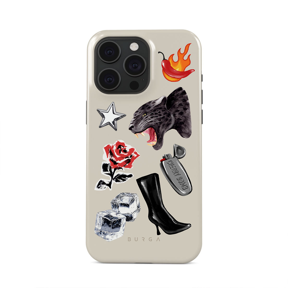 This design features: black panther, red rose, burning bell pepper, silver lighter, black knee-high boots, ice cubes, silver star