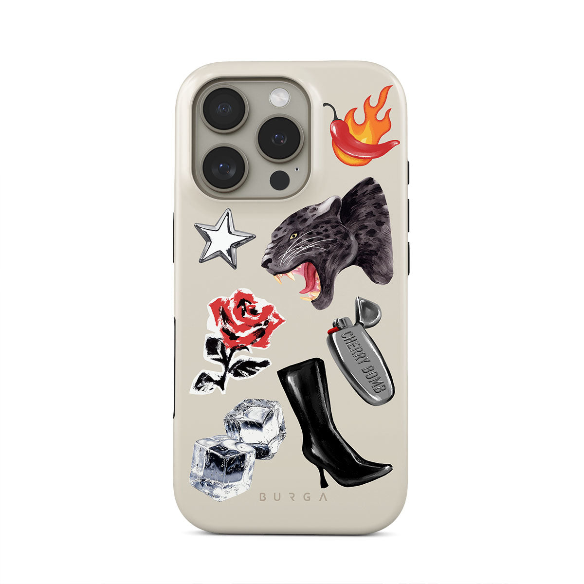 This design features: black panther, red rose, burning bell pepper, silver lighter, black knee-high boots, ice cubes, silver star